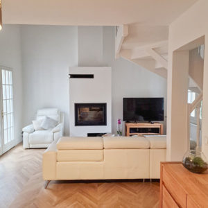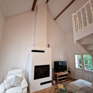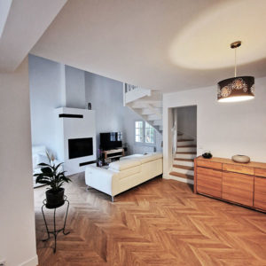 Sur l’ensemble du rdc, réfection des peintures, pose d’un carrelage imitation parquet, création d’un placard sur mesure dans l’entrée, changement de la cheminée et meubles de cuisine
